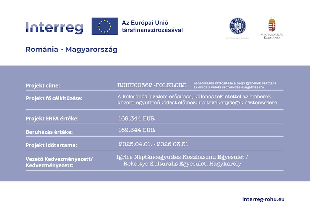 A rendezvény a ROHU00562 – FOLKLORE Interreg projekt keretében valósul meg a nagykárolyi Rekettye Kulturális Egyesülettel társszervezésben.